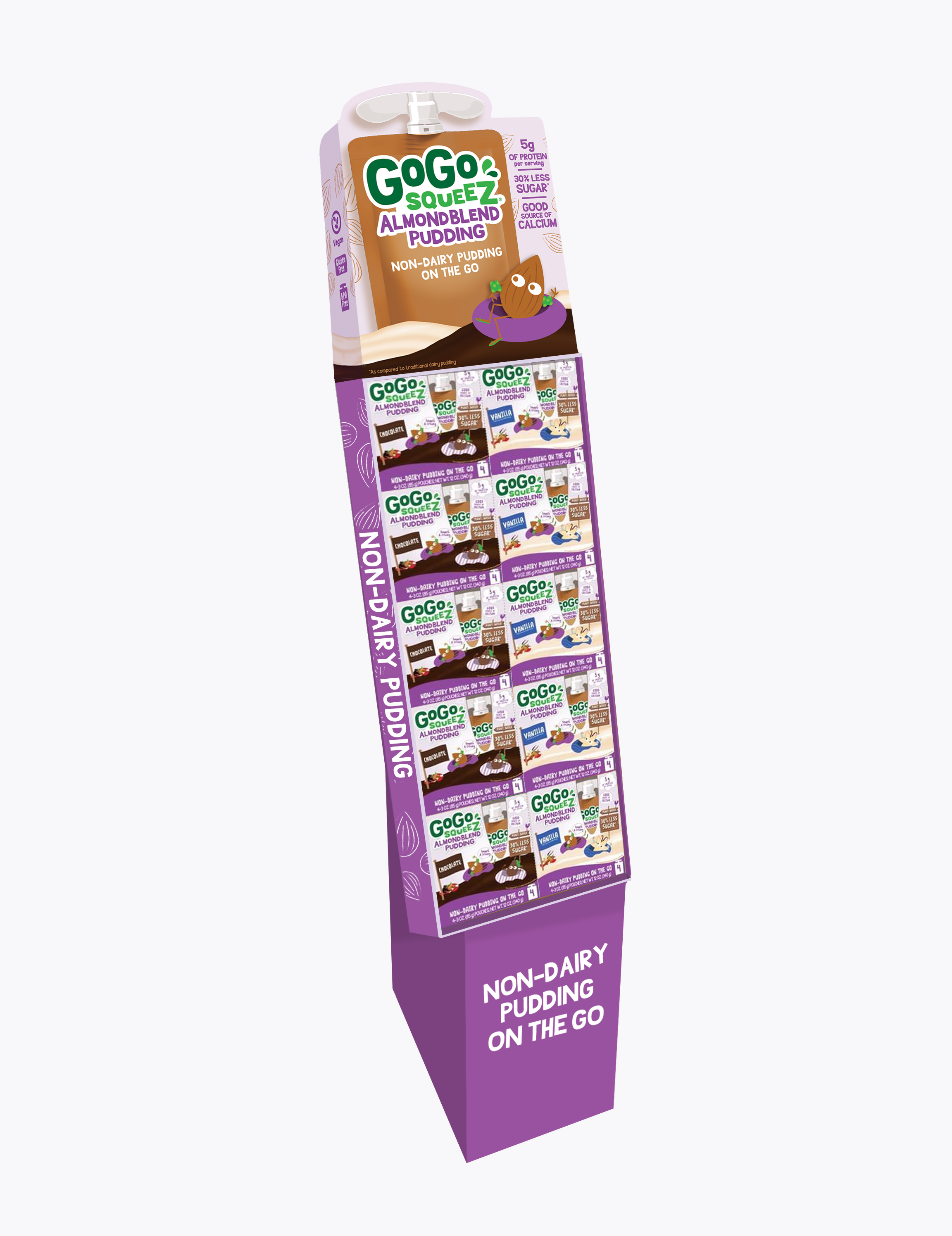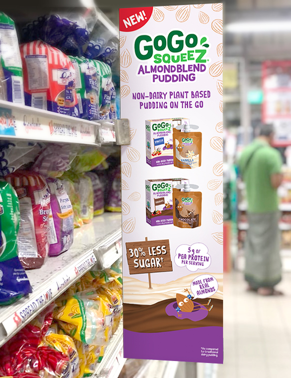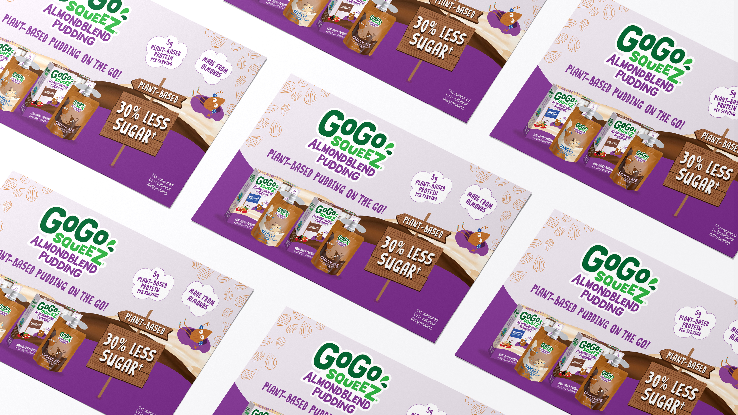 Launching AlmondBlend pudding was a big step for GoGo squeeZ, as it signified stepping outside the world of fruit & veggies. For this project, my role spanned a range of design– including but not limited to: digital design, visual merchandising design, experiential design, and branded merchandise design. From crafting engaging online visuals to developing immersive experiences, the goal was to get kids and families excited about this new innovation.